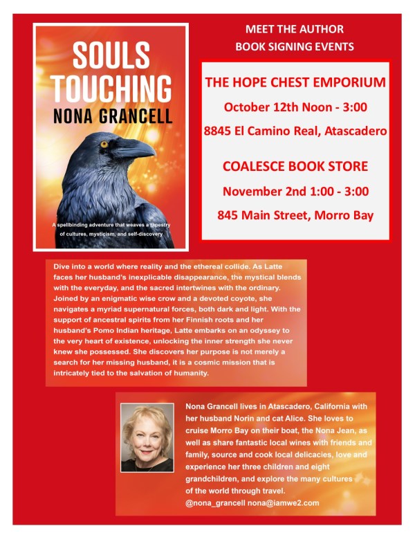 I am pleased to announce that I have two Meet the Author / Book Signing events with two local women owned businesses who happen to play important roles in my book, SOULS TOUCHING. The Hope Chest Emporium located in Atascadero and especially the owner, Karen McNamara, have been friends since Norin and I moved to... Continue Reading →